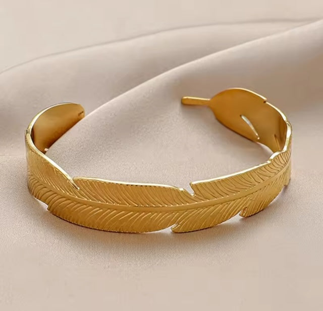 18K Gold-Plated Leaf Feather Open Cuff Bangle